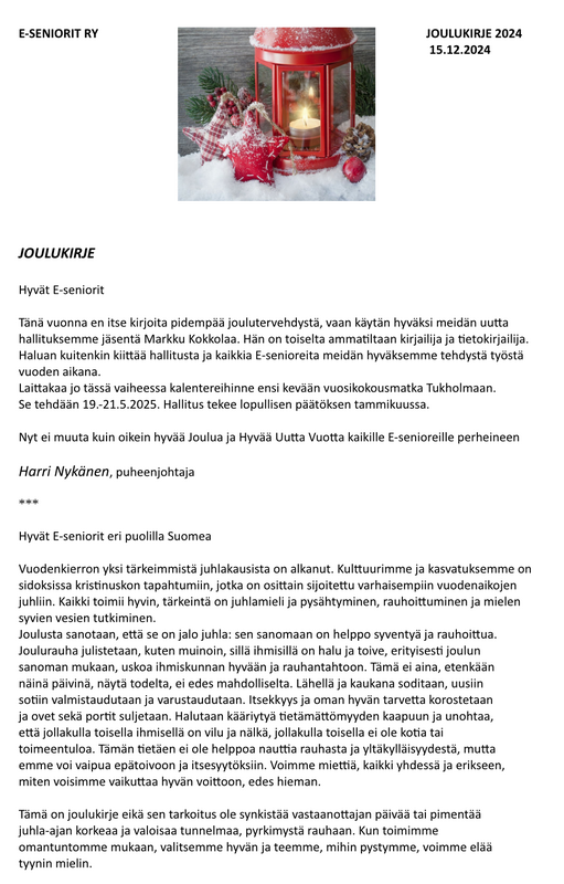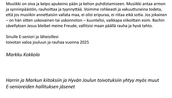 Muistattehan myös, että Markku Kokkola työstää E-seniorien ja sen edeltäjien vaiheita Liikkeenjohdon yhdistyksen perustamisen 100-vuotismerkkivuotta 2019 varten. Hän toivoo muistitietoa ja tarinoita liikeenjohdon ja keskijohdon työaikaisten ja eläkevuosien yhdistystoiminnasta ja myös työelämän muistoja. Osoite Markku Kokkola, Rekryytinkatu 11, 94600 Kemi
