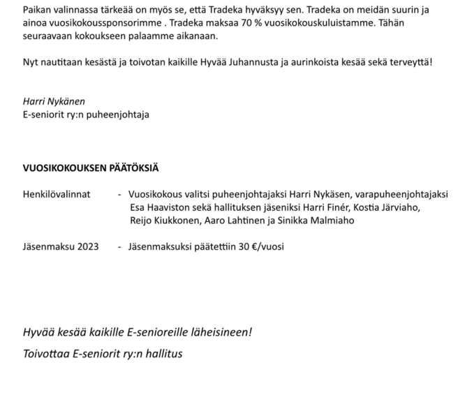 Hyvä E-seniori, ellei vuosikokouskutsu ole sinua tavoittanut, ota yhteys Sinikka Malmiahoon ensisijaisesti sähköpostilla sinikka.malmiaho(at)gmail.com tai (puh 040 5279981)