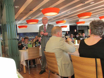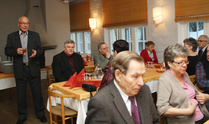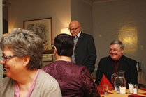 Iltajuhla alkoi kello 18.00 kuohuviinilasin nostamisella. Ruoka oli maittavaa ja se nautittiin iloisen puheensorinan säestyksellä. Ruokailun jälkeen juhlistimme kunniapuheenjohtaja Reijo Kiukkosta. Hänet valittiin viime vuoden vuosikokouksessa yhdistyksemme kunniapuheenjohtajaksi, mutta koska hän ei silloin päässyt mukaan terveydellisistä syistä niin juhlimme häntä tänä vuonna. Hallituksen jäsen Harri Finér piti pienen puheen Reijolle, jonka jälkeen Reijo kukitettiin. Myös vaimo Marjut oli mukana Reijon vieressä.