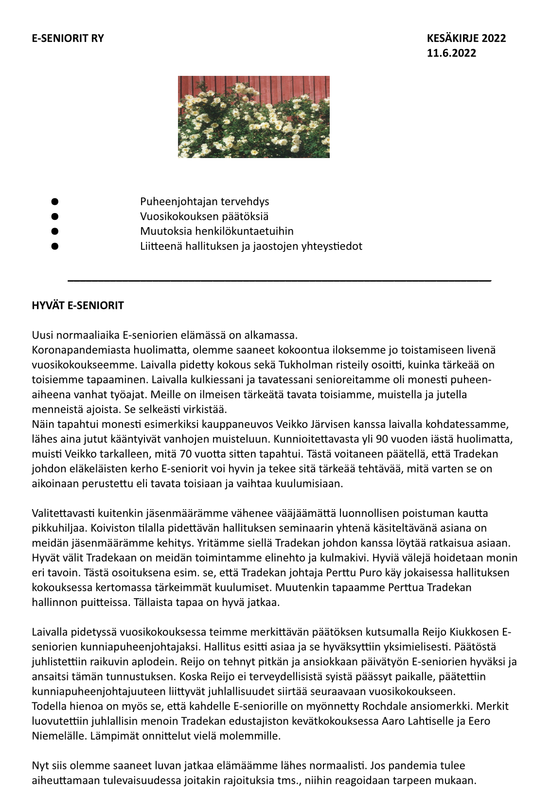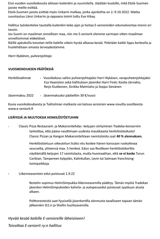 E-seniorit ry:n kutsu vuosikokoukseen 22.05.2023 Helsinkiin.
